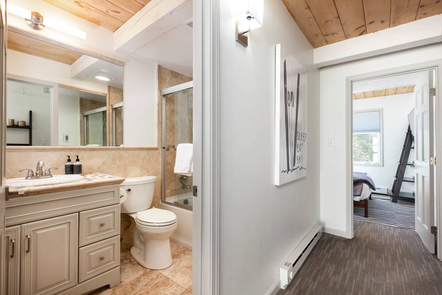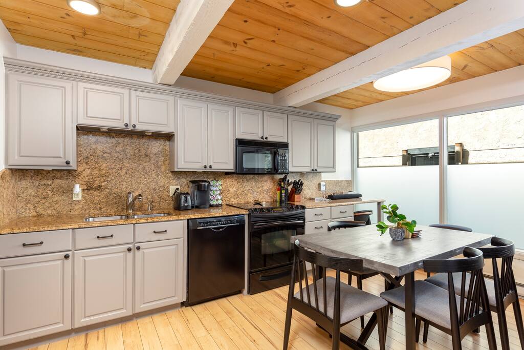 Featuring three master bedrooms upstairs, each with a queen sized bed and the third master has two queen beds. Both master bedrooms have views of AJAX (Aspen Mountain), closets, and TV's in each room. The downstairs has an open floor plan, a 65 inch HD Smart TV, a stove, quartz countertops, stainless appliances, full kitchen, a huge sky light! The private balcony is quiet and gets sun throughout the day...in the summer evenings its great spot to grill on the Webber Gas Grill and enjoy the views. There is a built in desk if you need to do any office work on your vacation as well as super strong WiFi Both bathrooms are located upstairs with ample storage throughout the unit There is (1) assigned parking spaces for this unit upon request. This Aspen townhouse sleeps up to eight guests but please NOTE: QUIET HOURS ARE FROM 10P-7A AND WE DO NOT ALLOW GROUP GATHERINGS OR PARTIES. The total total square footage of the townhouse is 1,050sf.